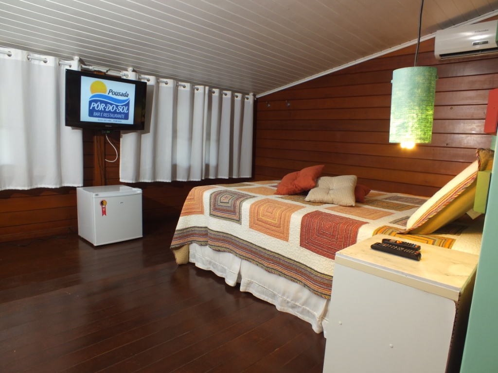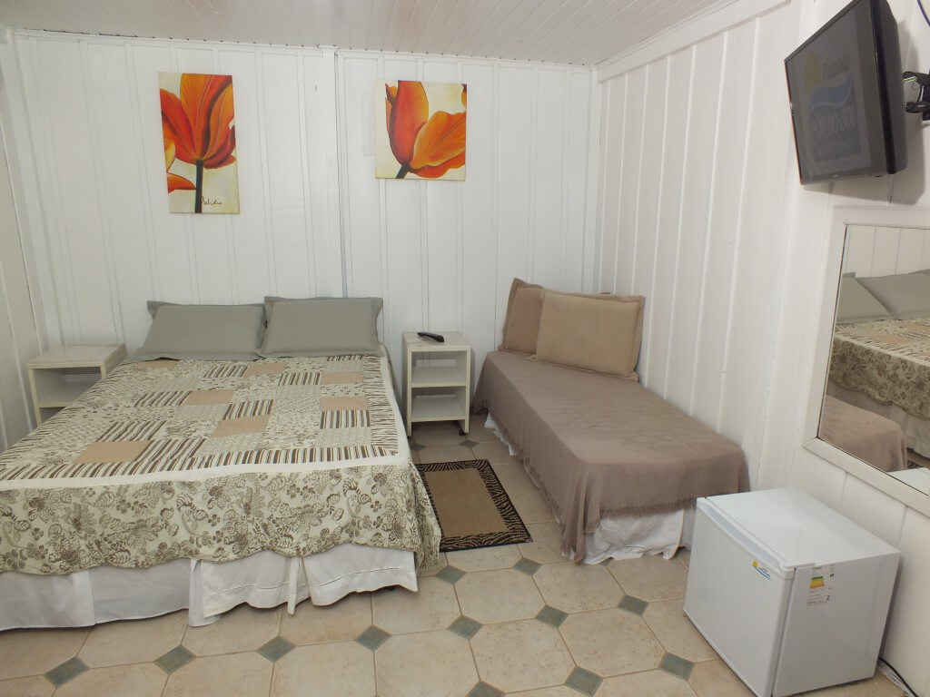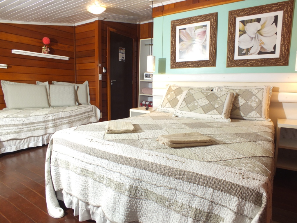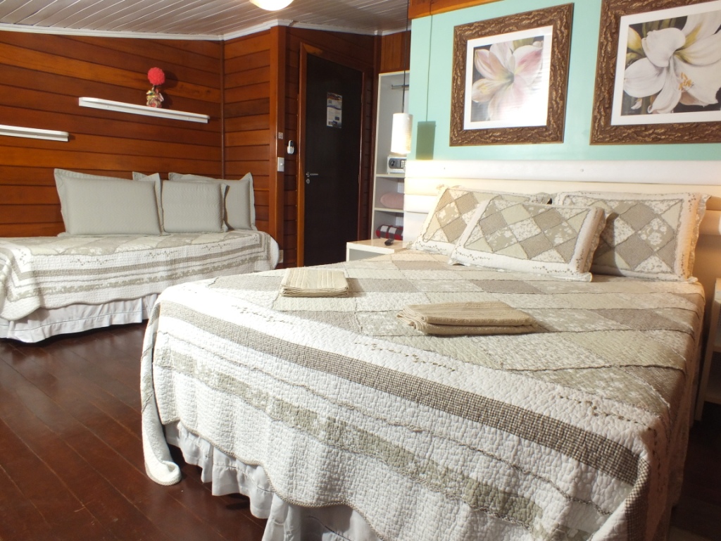 Suíte localizada no andar superior, com vista para o mar, ar condicionado, frigobar, 1 cama de casal e 2 de solteiro box, TV LCD 32.