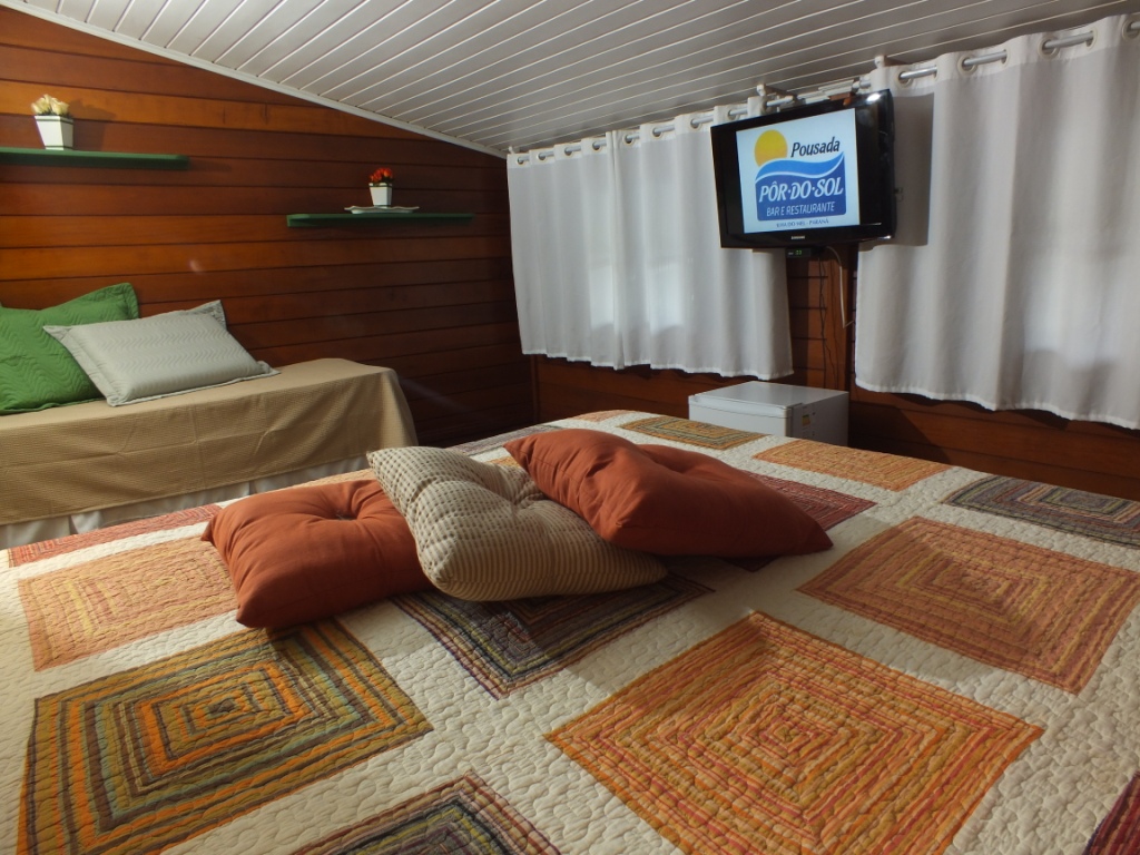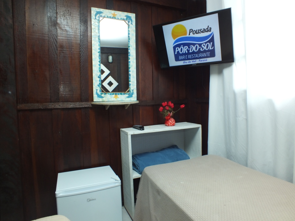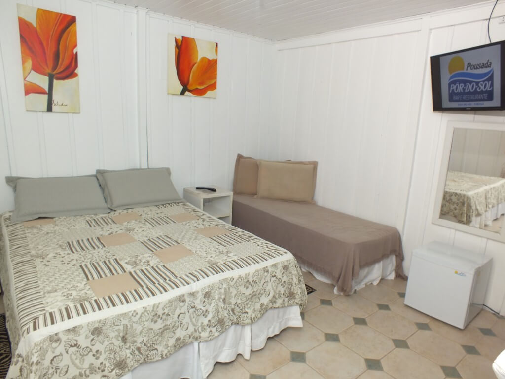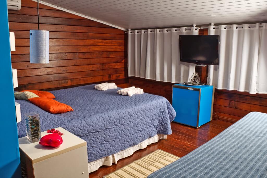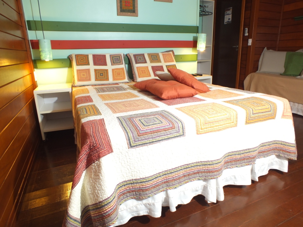 Suíte localizada no andar superior, com vista para o mar, ar condicionado, frigobar, 1 cama de casal e 2 de solteiro box, TV LCD 32.