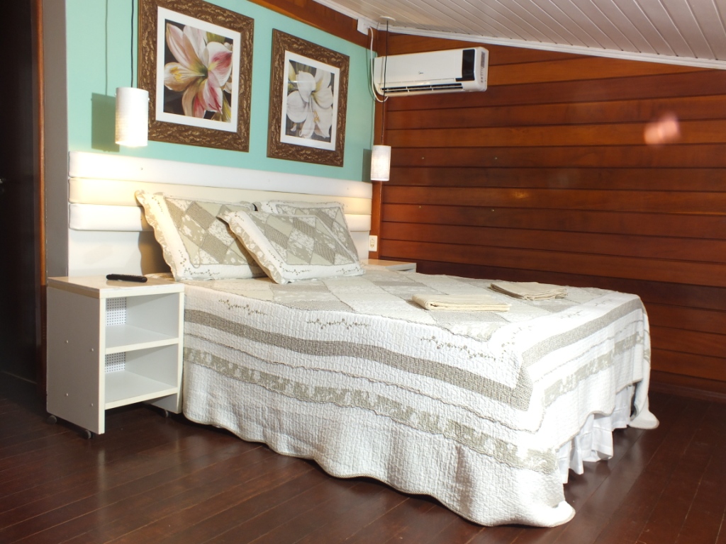 Suítes localizadas no andar superior e térreo, com ar condicionado, frigobar, TV LCD 32, camas box.