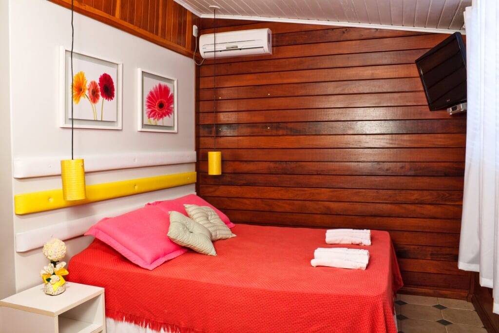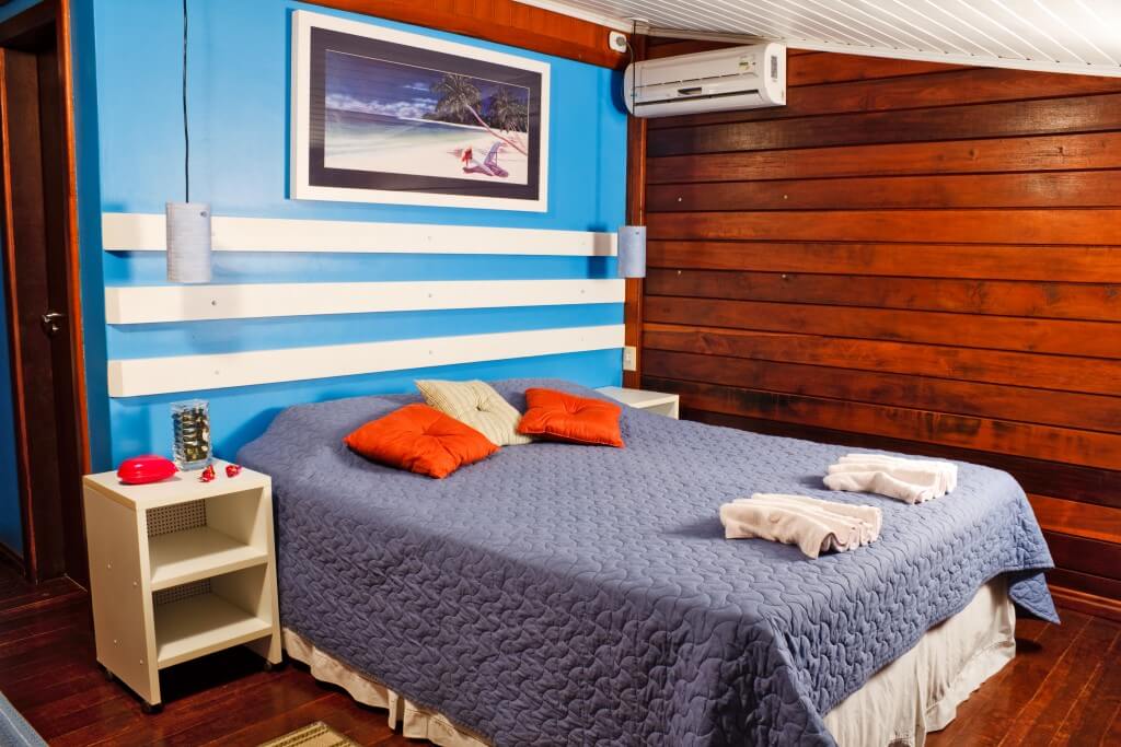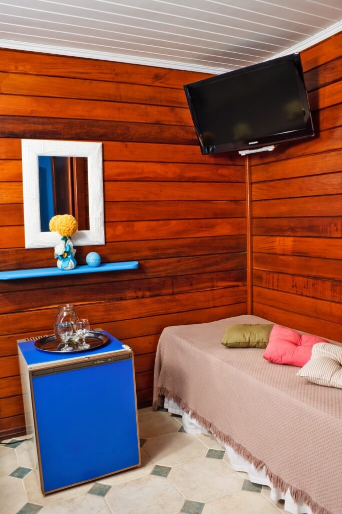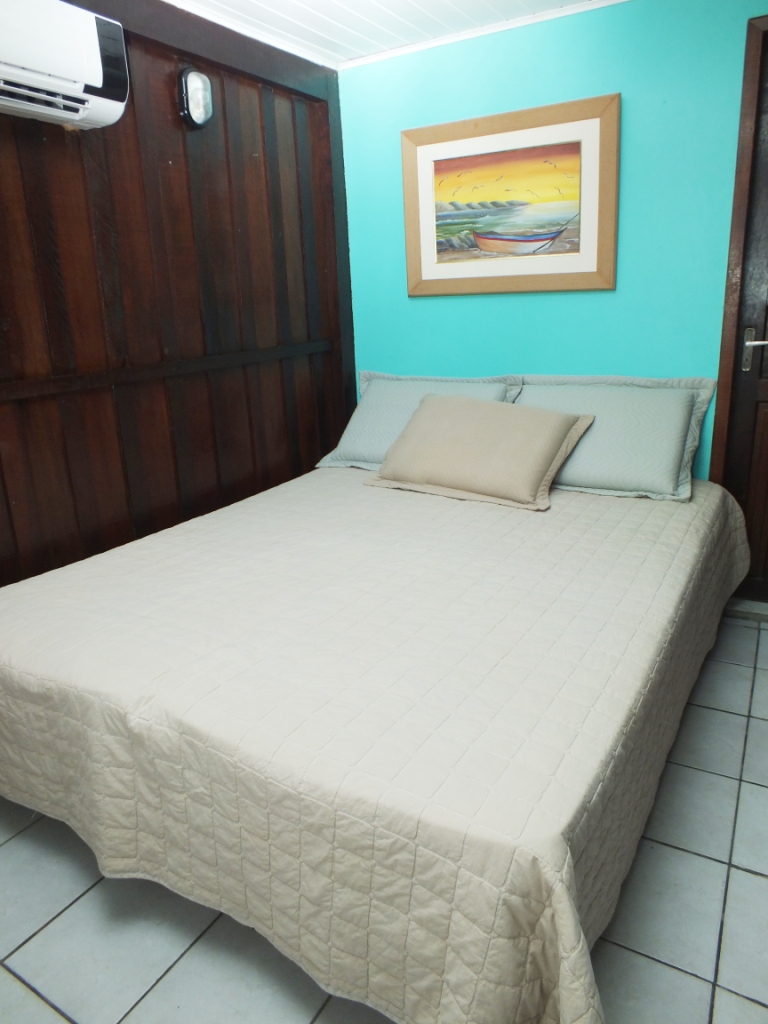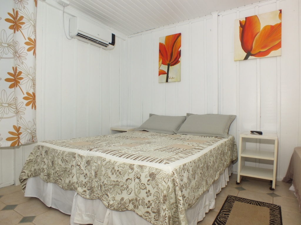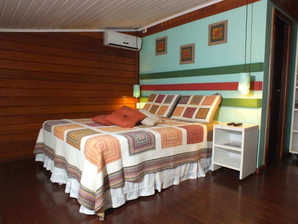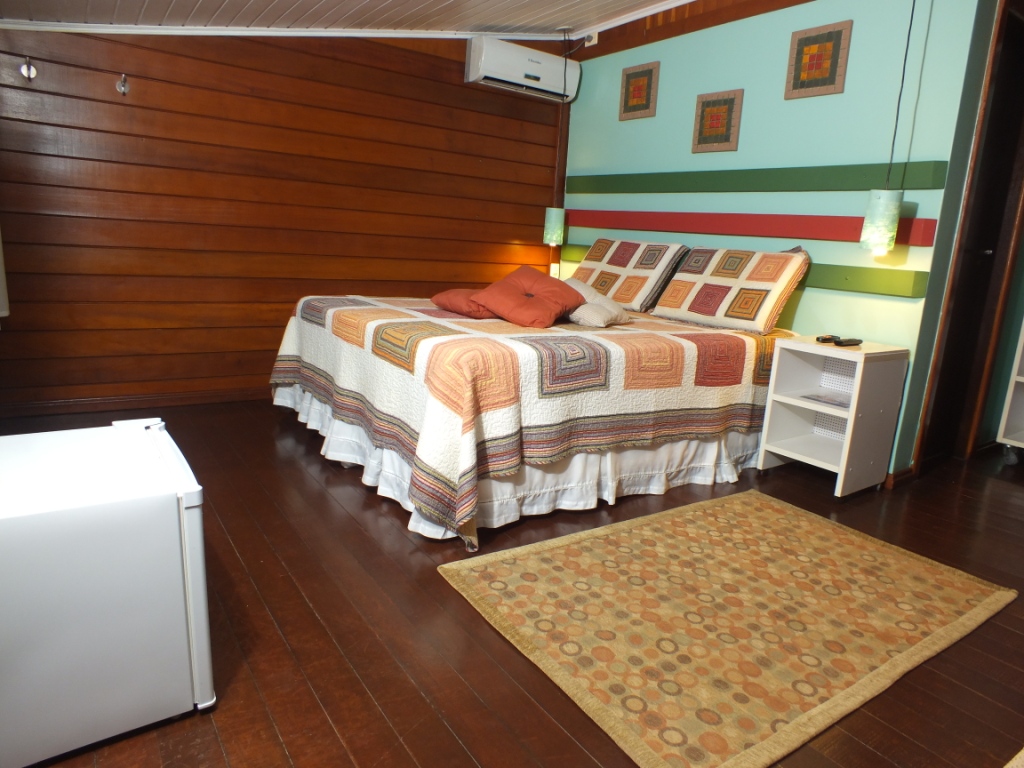 Suíte com ar condicionado, frigobar, TV 32, cama box. Localizado no térreo com acesso externo.