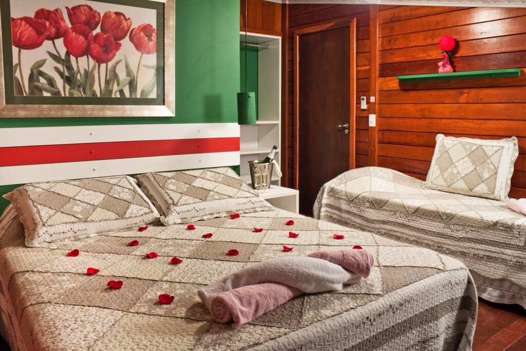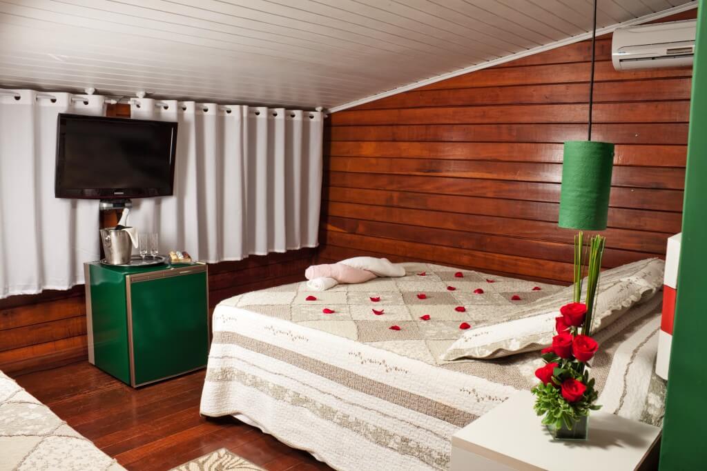 Suítes localizadas no térreo, com ar condicionado, camas box, frigobar, TV LCD 32.